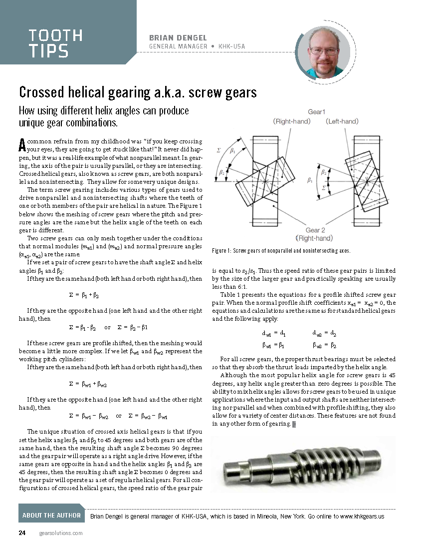 A common refrain from my childhood was “if you keep crossing your eyes, they are going to get stuck like that!” It never did happen, but it was a real-life example of what nonparallel meant. In gearing, the axis of the pair is usually parallel, or they are intersecting. Crossed helical gears, also known as screw gears, are both nonparallel and nonintersecting. They allow for some very unique designs.